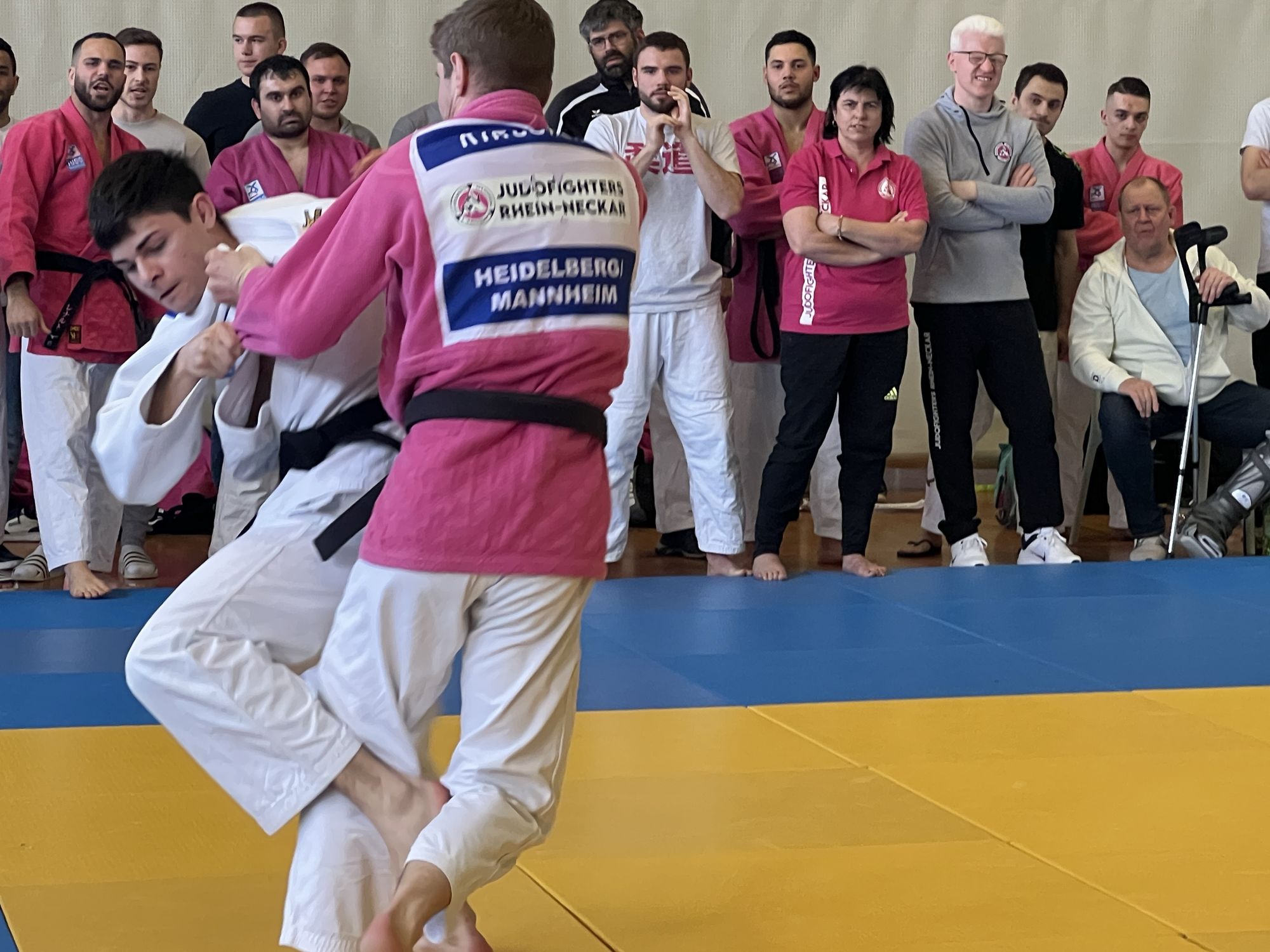 „Haanka“ Bathuyag (über 100 Kilogramm) zwang seinen griechischen Gegner und ehemaligen U 18 Europameister Ambra Bourntouli in die die Verlängerung, um dann mit einem Hüftwurf die entscheidende Wertung zu holen. Der erst 16 - Jährige Matteo Gruber (bis 60 Kilogramm) ließ Mohamed Bada im Bodenkampf keine Chance, drehte den Heidelberger auf den Rücken, aus dem anschließenden Haltegriff gab es kein Entrinnen.