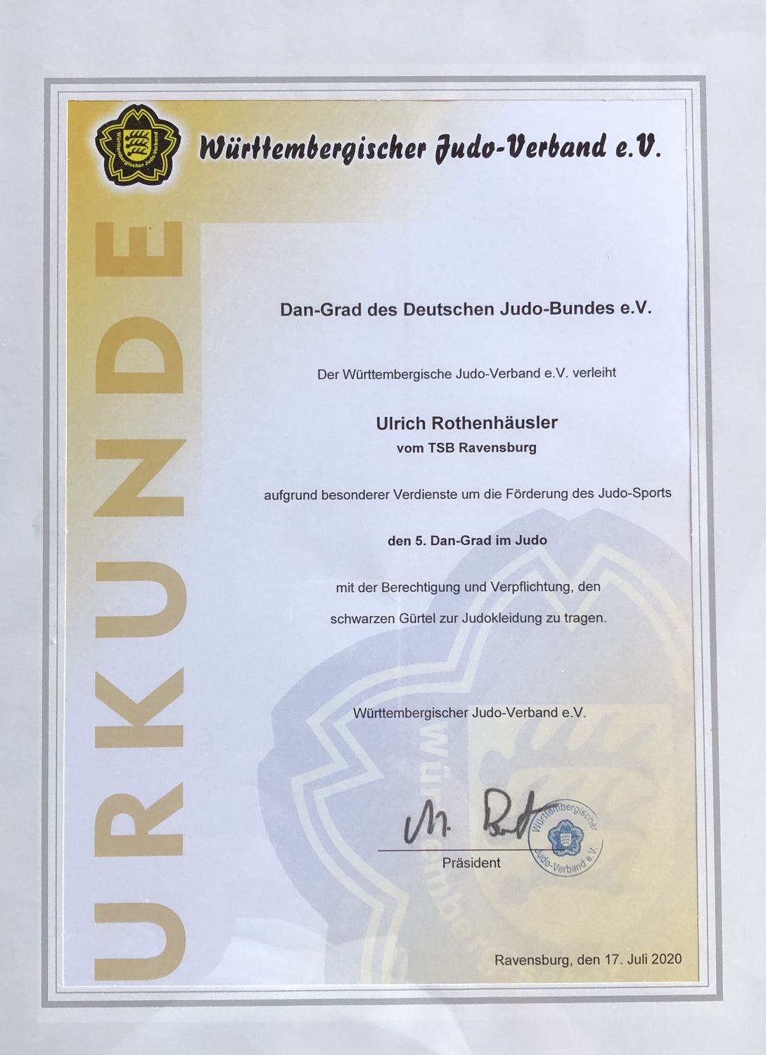 TSB Trainier Uli Rothenhäusler erhielt aufgrund besonderer Verdienste um die Förderung des Judosportes vom Württembergischen Judoverband den 5. Dan verliehen.