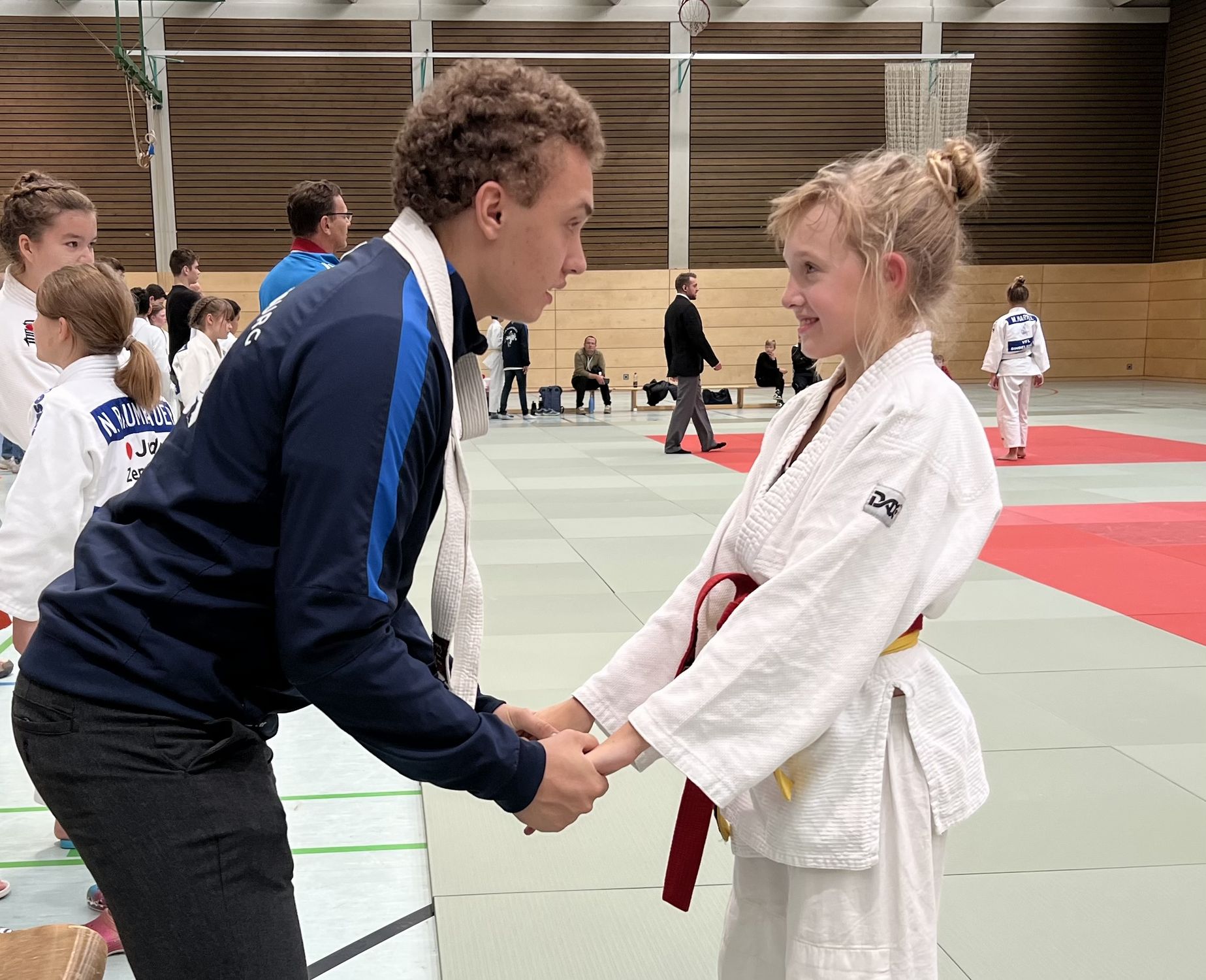 Am Ende des Tages war der der jüngste und leichteste Athlet der Ravensburger der mit dem größten Grinsen im Gesicht. Ferdinand Schick, der im Rahmen der Kooperation mit der St. Christina Schule erst im Frühjahr mit Judo begonnen hatte, hatte alle seine Gegner auf den Rücken gelegt. Vier Kämpfe, vier Siege, am Ende des Tages ein starker Hüftwurf gegen Nevio Russo vom JC Köngen, bedeuteten für Schick den Titel in der mit 14 Teilnehmern stark besetzten Gewichtsklasse bis 31 Kilogramm.