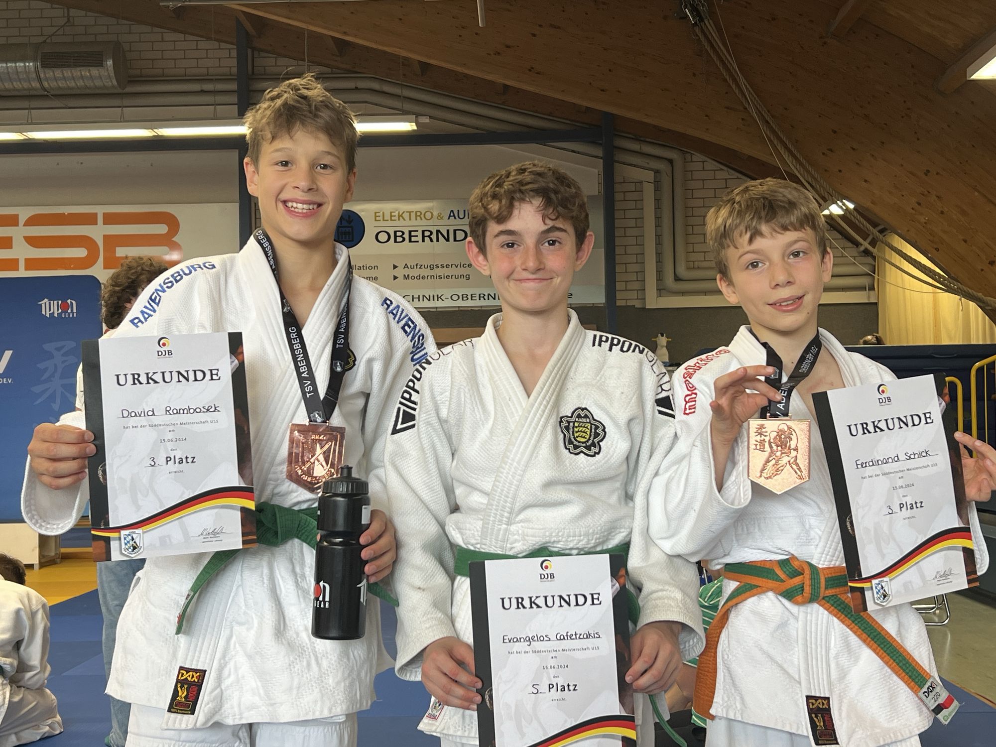 Bei den Jungs kämpfte sich Ferdinand Schick mit zwei Siegen ins Halbfinale gegen den starken Batiuk Kyryl (Jahn Nürnberg/ Bayern). In einem spannenden und offenen Kampf hielt Schick gegen den späteren Süddeutschen Meister lange mit, musste sich aber am Ende mit einer Selbstfalltechnk geschlagen geben. Im kleinen Finale besiegte der Ravensburger Kämpfer Lukas Wagner (JZ Heubach/ Württemberg) im Golden Score mit einer schönen Kombination und sicherte sich so die Bronzemedaille bis 34 Kilogramm.