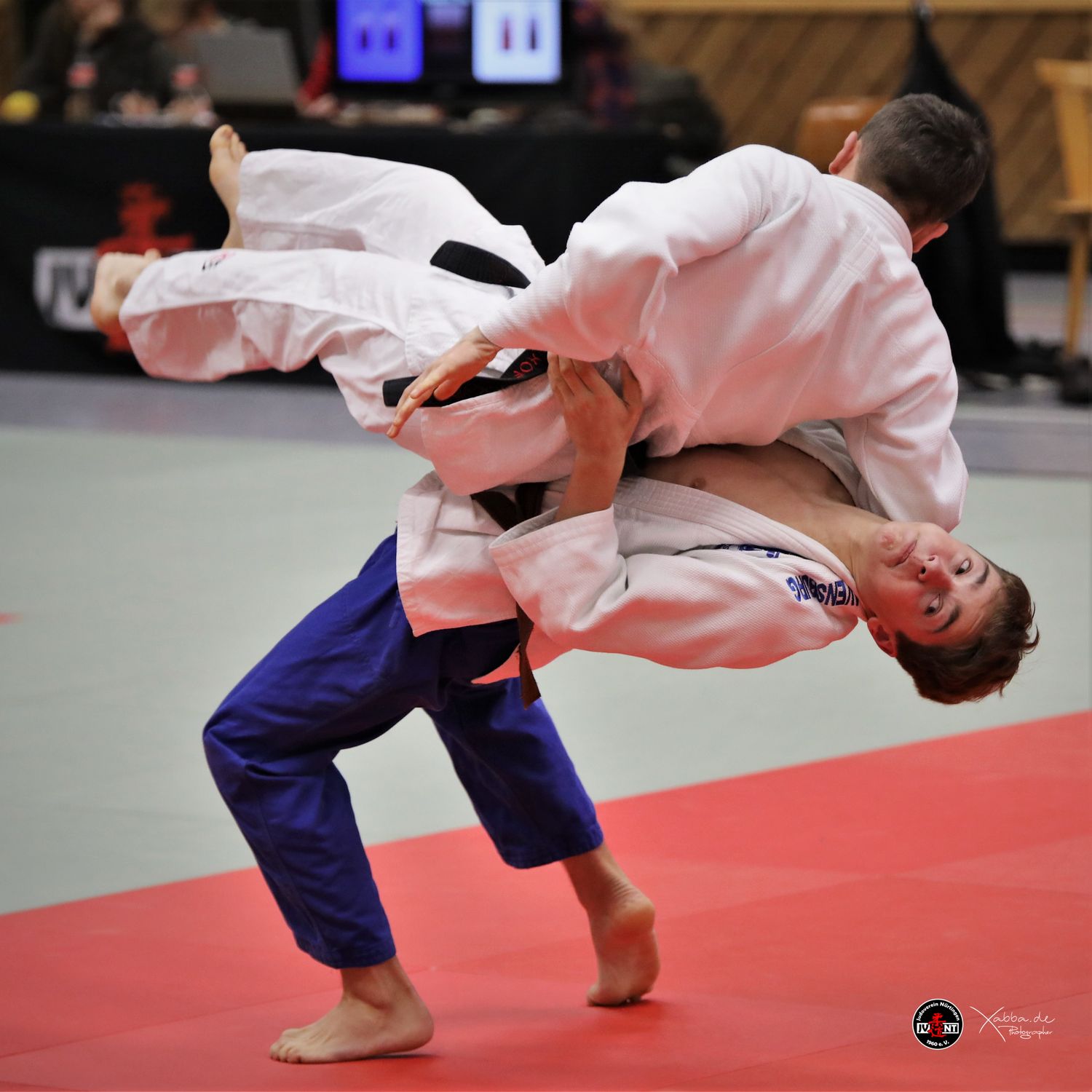 Hochspannung im Kampf gegen die Kampfgemeinschaft des JV Nürtingen/ JZ Heubach und den TSB Judoka. Im Vorjahr standen sich beide Teams in Brandenburg im Halbfinale der Deutschen Meisterschaft gegenüber. Nürtingen hatte sich mit 3:2 durchgesetzt und den Vizetitel geholt. Die Ravensburger wurden am Ende Fünfter. Auch dieses Jahr lagen die Oberschwaben schnell mit 0:2 im Rückstand. Dann holte Elis Bonitz (bis 77 Kilogramm) mit einem Schulterwurf den ersten Punkt für die Oberschwaben. Julius Kalfier (bis 58 Kilogramm) musste gegen den Deutschen Vizemeister Valentin Hofgärtner antreten. Kalfier diktierte den Kampf deutlich und holte mit einem spektakulären Aushebewurf den Ausgleich zum 2:2. Arne Böhm (bis 50 Kilogramm) war seinem Gegenüber körperlich zunächst deutlich unterlegen, holte dann aber mit einem schulmäßigen Hüftwurf den entscheidenen Punkt zum 3:2 Sieg.